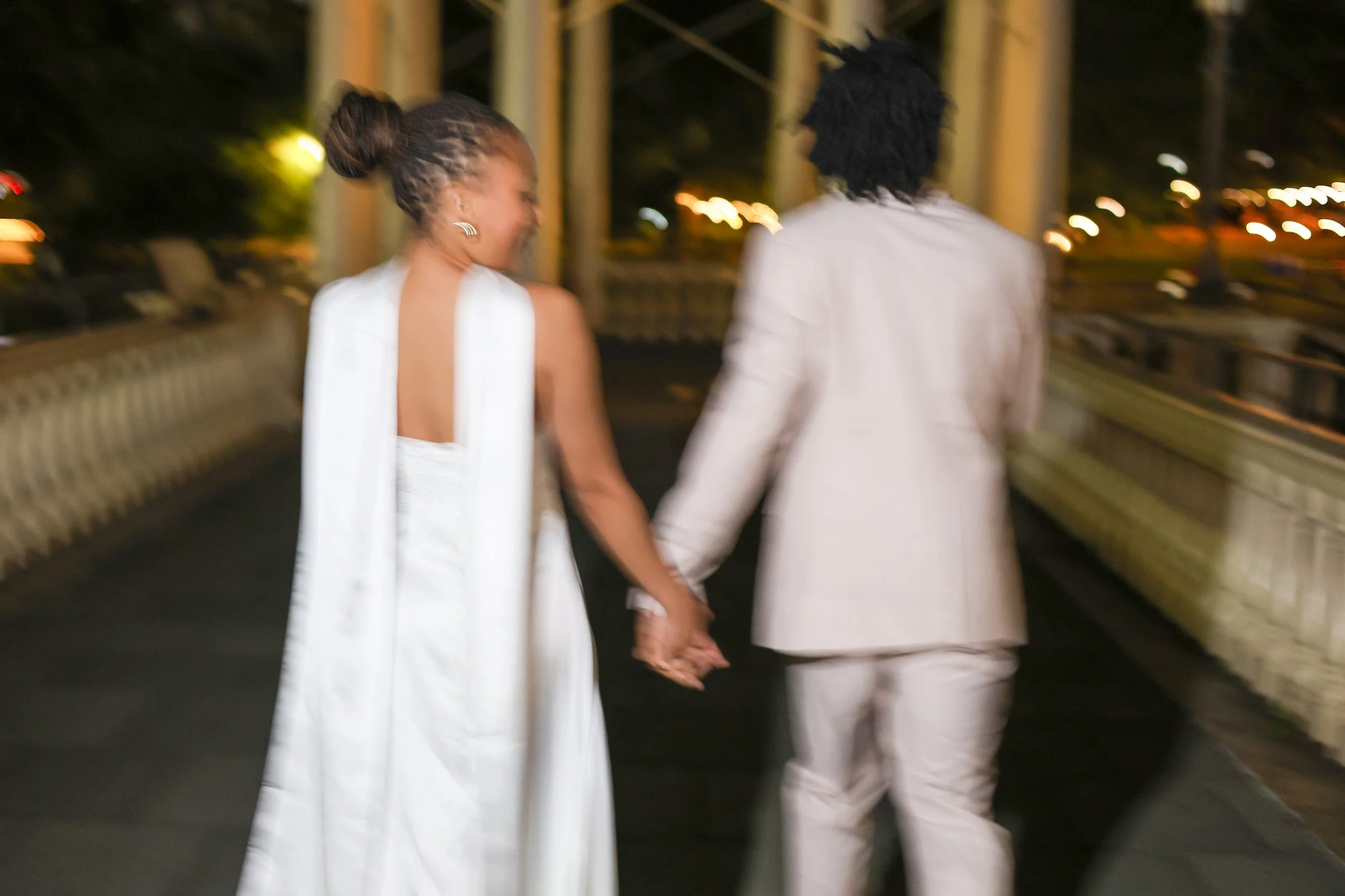 A couple dressed in formal attire holding hands under a bridge at night, with city lights in the background.